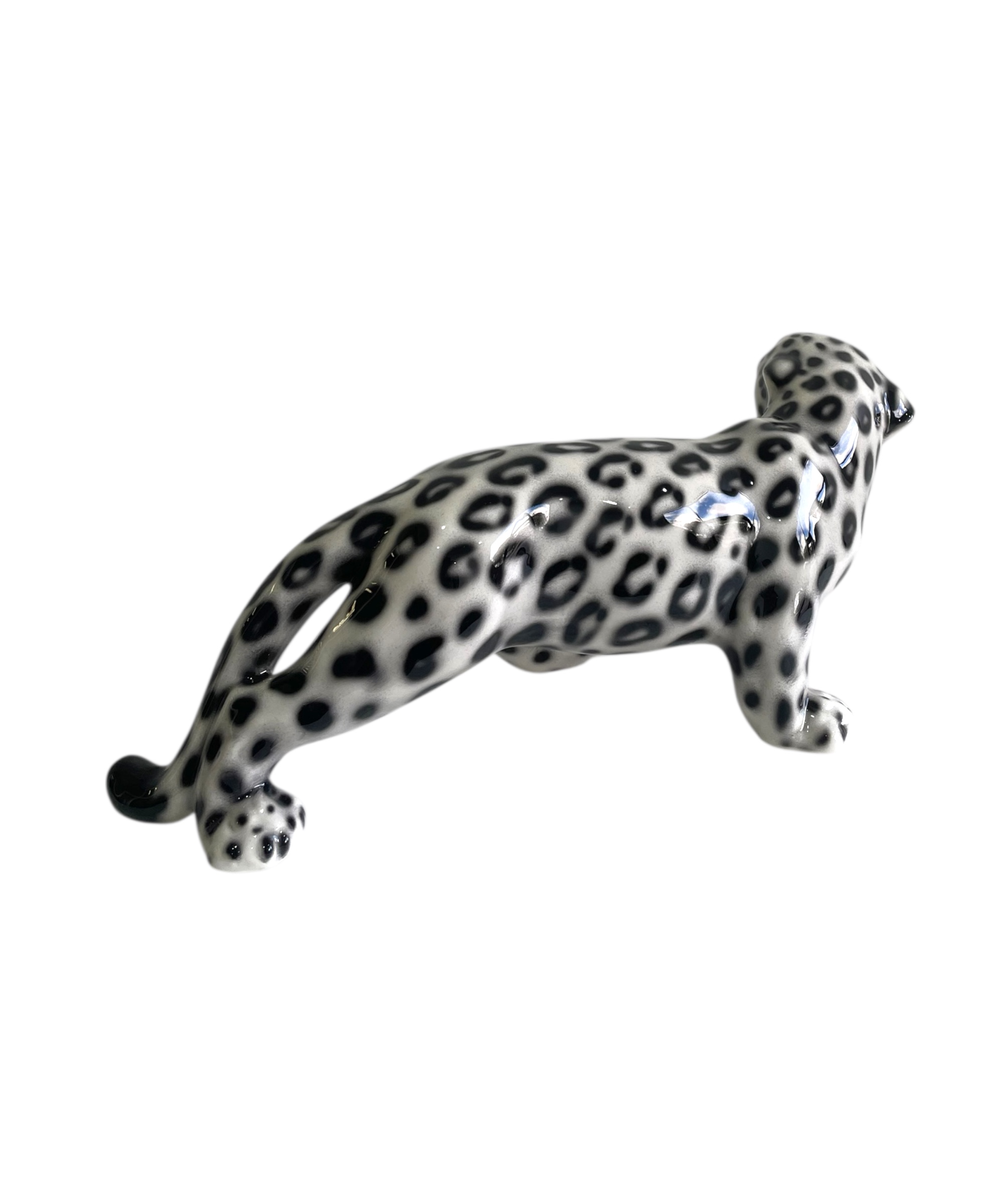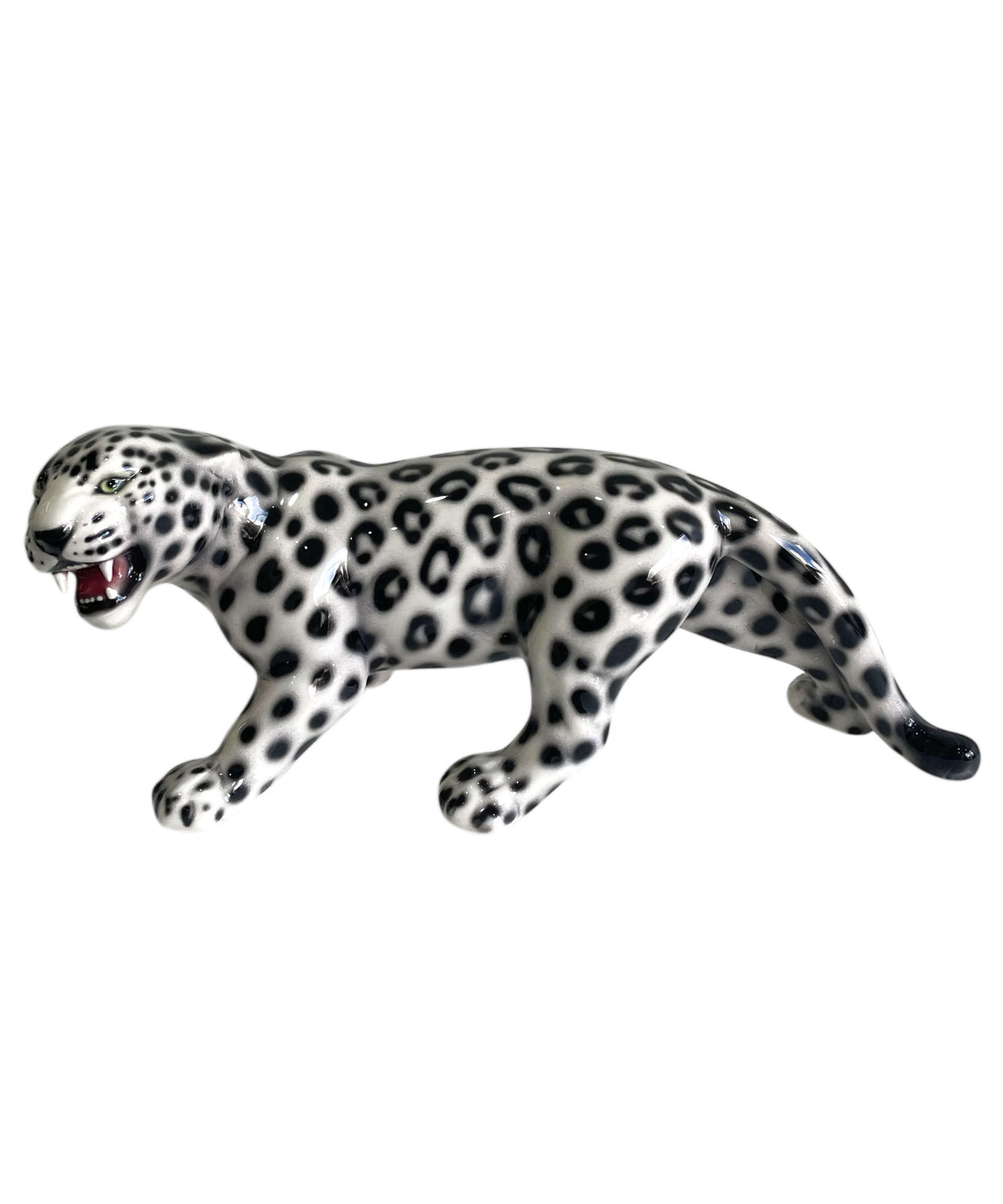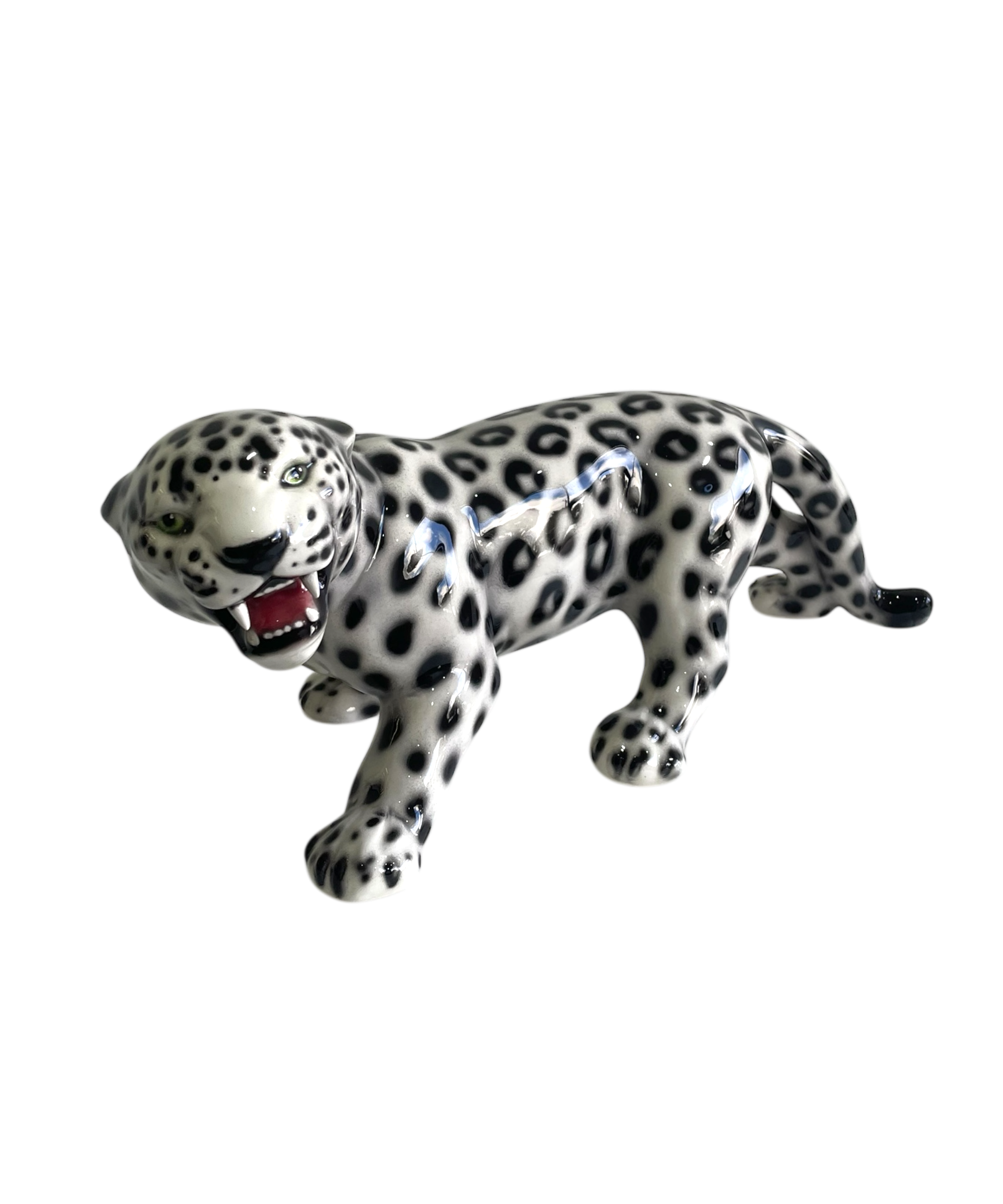 The crouched leopard is a spectacular handcrafted imitation of the wildcat captured through ceramic sculpture, displaying its green eyes and black and white glossy coat.